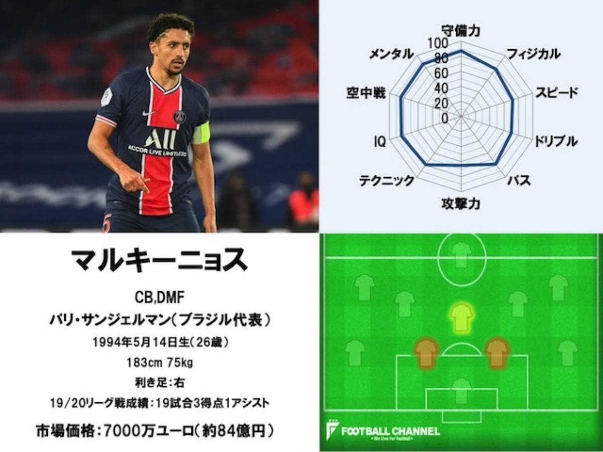 21サッカー選手能力値ランキング26位 Dfマルキーニョス パリ サンジェルマン フットボールチャンネル